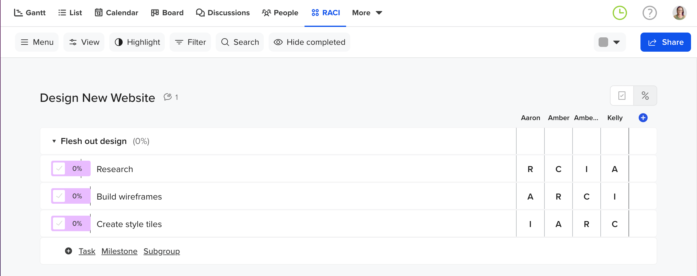 Note: If a user’s been given a RACI role for a task but hasn’t been assigned to that task, their name won’t appear next to the task in Gantt view. You can always see your project’s full RACI chart by toggling to the RACI tab in the top navigation.